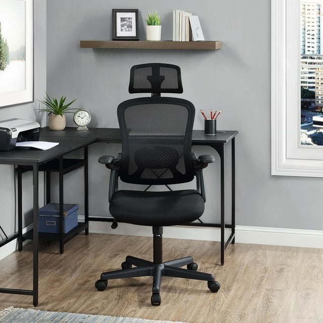 The Ergonomic Office Chair is the perfect chair to get you through your workday. The chair back features a breathable mesh fabric and lower lumbar support panel. The nylon panel contours to your lower back providing a nice lower lumbar support and helping improve posture. The adjustable headrest is included for added neck and head support. The customizable height adjustment allows you to position the headrest to fit your needs and help relieve any shoulder or back tension. Nylon armrests are ergonomically positioned for additional arm support while you type or work. The seat is generously padded with high-density foam that contours to your body and creates a luxurious seating surface. Underneath the chair you will find the pneumatic gas-lift seat-height control and tension/tilt knob that help with customizing the chair to fit your needs. The durable nylon base is scuff proof and sits atop five dual caster wheels that allow you to move effortlessly around the room. The sleek black fabric and simple, classic look of this chair makes it a great fit in any workspace. Whether you are an adult who works from home, have a studio for working on your craft or you go into a commercial office space, the Ergonomic Task Chair with Adjustable Headrest will fit nicely with any room decor and enhance the look of your workspace