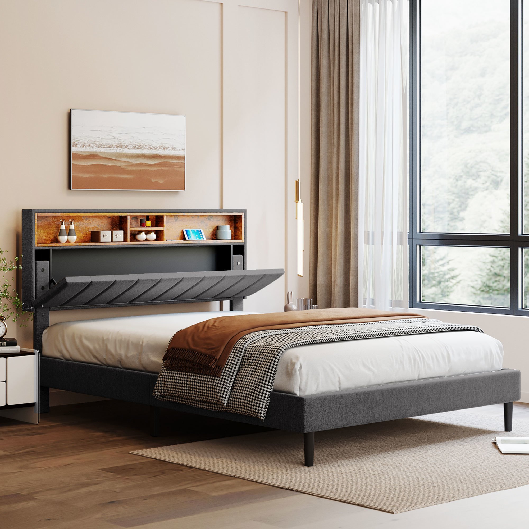 Queen Size Upholstered Platform Bed with Storage Headboard and USB Port, Linen Fabric Upholstered Bed (Gray)